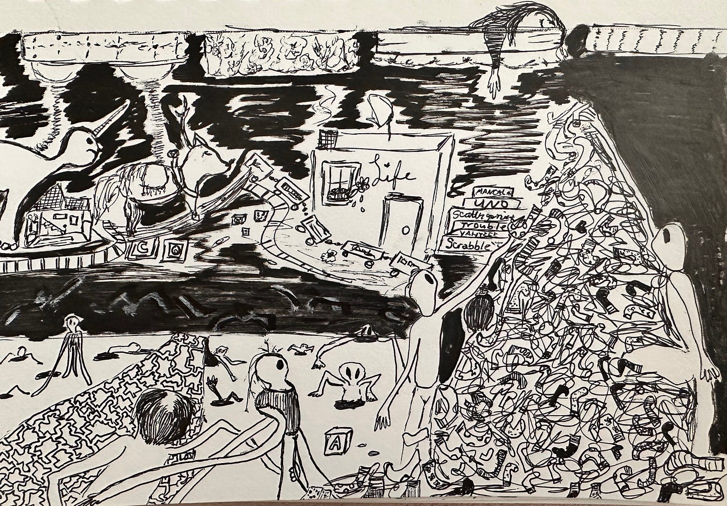 Walls of board game boxes leaned against structures made from dollhouses welded together.